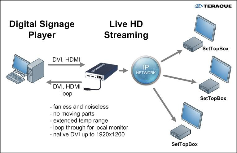 En el sector de digital signage, la salida de un reproductor PC de digital signage se capta con el codificador ENC-300. La publicidad y el contenido de información y entretenimiento se pueden transmitir a cientos de aparatos de televisión o a usuarios de PC. Un ejemplo típico es el uso en los casinos de hotel. El contenido seleccionado de señalización digital del casino se puede proporcionar como canales de televisión adicionales en las habitaciones del hotel a través del sistema IPTV. La reproducción del contenido de señalización de alta definición es posible en las set-top boxes estándar IPTV, como las series Amino 140 series. Un flujo de datos de video individual puede ser enviado a cuantos dispositivos finales se necesite, mediante el uso de transmisión de flujo de multidifusión.