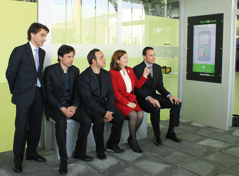Isabel López, directora general de JCDexaux; Javier Pujol, consejero delegado de Ficosa; Norberto Mateos, director general de Intel; Carlos Silva, director de ADmira; y Francisco Salcedo, director de Estrategias y Mercados de Telefónica han apadrinado la nueva marquesina nacida de SmartCities Lab, iniciativa que busca hacer ciudades mejores para sus ciudadanos mediante el uso de las nuevas tecnologias y que tiene su sede en el distrito tecnológico del 22@ de Barcelona.
