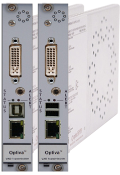 Otra de las novedades de Opticomm es un nuevo miembro de la familia Optiva, el OTC-1DVI2AUSB. Esta tarjeta de inserción expande la plataforma Optiva para DVI, audio, USB 2.0 vía extensiones de cobre, enviando señales hasta a 100 metros sobre un solo cable CAT5/6. Todas las nuevas tarjetas CATx de esta empresa encajan en todos los cofres Optiva y utilizan las opciones de interfaz de cobre de la matriz HDMX.