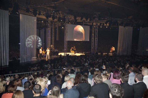 - Proyección a 3 pantallas principales, en el escenario, de 5,2×3 mts cada una, con proyectores de 20.000 lúmens Barco FLM HD