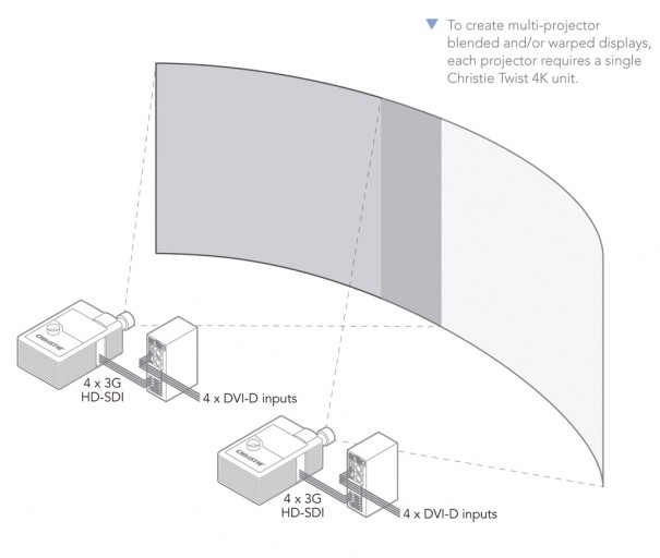 Para satisfacer la creciente demanda de proyección 4K para aplicaciones distintas al cine, Christie ha anunciado en el International Broadcasting Convention (IBC) 2012 el lanzamiento oficial de Christie Twist 4K. Diseñada para los proyectores Christie 4K de 3 chips DLP, utilizados en aplicaciones de negocio, esta tecnología permite warping, blending e igualación de color en displays de múltiples proyectores en aplicaciones de instalación fija con pantallas grandes, incluyendo parques de atracciones, diseños automotrices, museos y planetarios que requieren imágenes excepcionalmente grandes en formato multicanal (en mosaico).