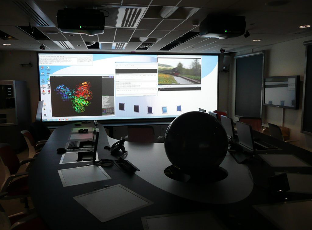 Cada uno de los 14 puestos de delegación de la mesa tiene su propia bandeja para ordenador portátil y, gracias a la instalación de cuatro cámaras de seguimiento ART TP, los científicos pueden utilizar un ‘mando de vuelo’ para desplazarse por las escenas generadas por ordenador que se muestran en la pantalla. Los datos se derivan utilizando software Techviz, mientras que un par de ordenadores portátiles instalados de forma permanente con tarjetas de captura de vídeo incorporadas ofrecen imágenes a los proyectores.