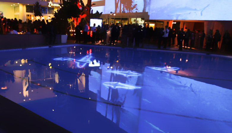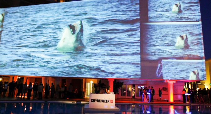 Con motivo de la fiesta por el 25 Aniversario del programa del Discovery Channel ‘Shark Week’, se pudieron ver un grupo de tiburones nadando en la piscina del hotel Beverly Hilton de Los Ángeles (EE.UU.). Afortunadamente, sólo eran imágenes proyectadas desde un módulo Christie YK200 de doble brazo, con un proyector DLP de 3 chips Christie Roadster HD20K-J incorporado para mover los escualos a un lado y a otro de la piscina.