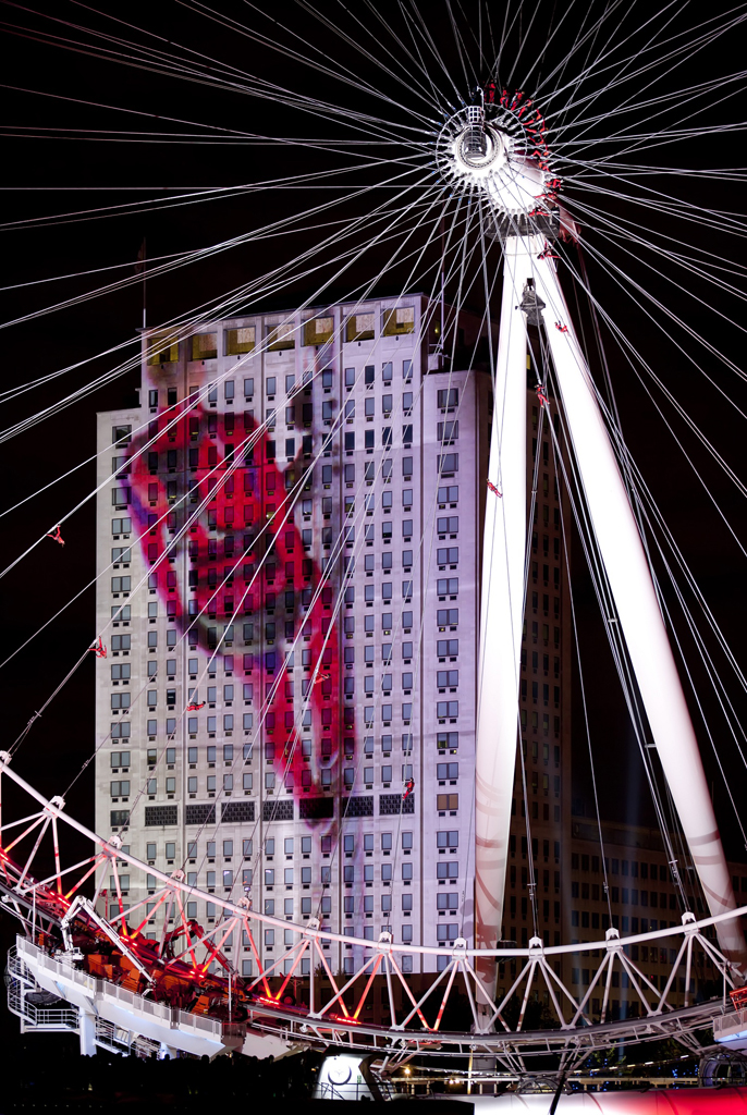 Con el fin de permitir que el mayor número posible de londinenses disfrutaran de la maravillosa experiencia, LIFT recurrió a los servicios de la empresa audiovisual QED Productions para que proyectaran imágenes de cámara en vivo de la actuación en el vecino Edificio Shell. En su emplazamiento en el Victoria Embankment, las cámaras mezclaron el visionado in situ, transmitiendo después las imágenes al otro lado del Támesis mediante una conexión de vídeo microondas HD, hasta el punto de proyección en el Southbank, en donde 20 de los Christie Roadster HD18K de QED proyectaron la acción en vivo sobre el icónico edificio de 107 metros de altura. La serie HD ofrece una imagen más ligera, de menor consumo energético y un 10% más brillante que cualquier otra de las existentes en el mercado. El propio Roadster HD18K contiene resolución de tecnología DLP 3-chip, con resolución full 1920 x 1080 e iluminación xenón, óptica de alta calidad y procesado de imagen de 10 bits.