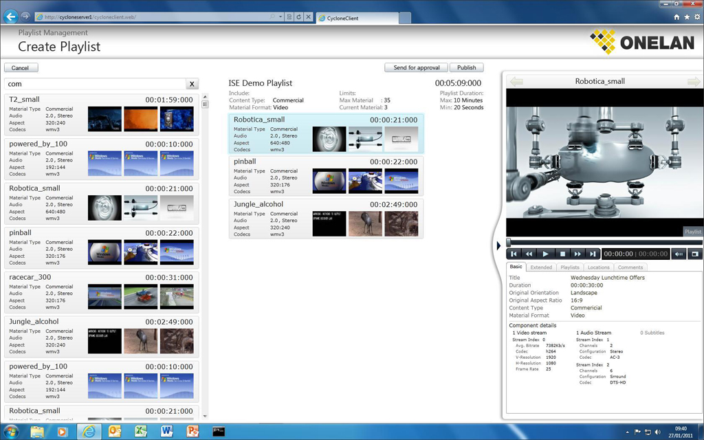En la feria ISE 2013 en el RAI de Ámsterdam (Pabellón 10, stand Q130), Onelan tiene previsto anunciar Cyclone, su nueva solución de gestión de contenidos para redes de señalización. Cyclone proporciona el suministro de campañas automatizado a señales digitales, pantallas LED, tablets, móviles y sitios web. El flujo de trabajo administrado y los metadatos permiten a Cyclone generar automáticamente listas de reproducción dirigidas específicamente, lo que permite al Cyclone escalar de las redes de decenas a cientos de miles de reproductores.