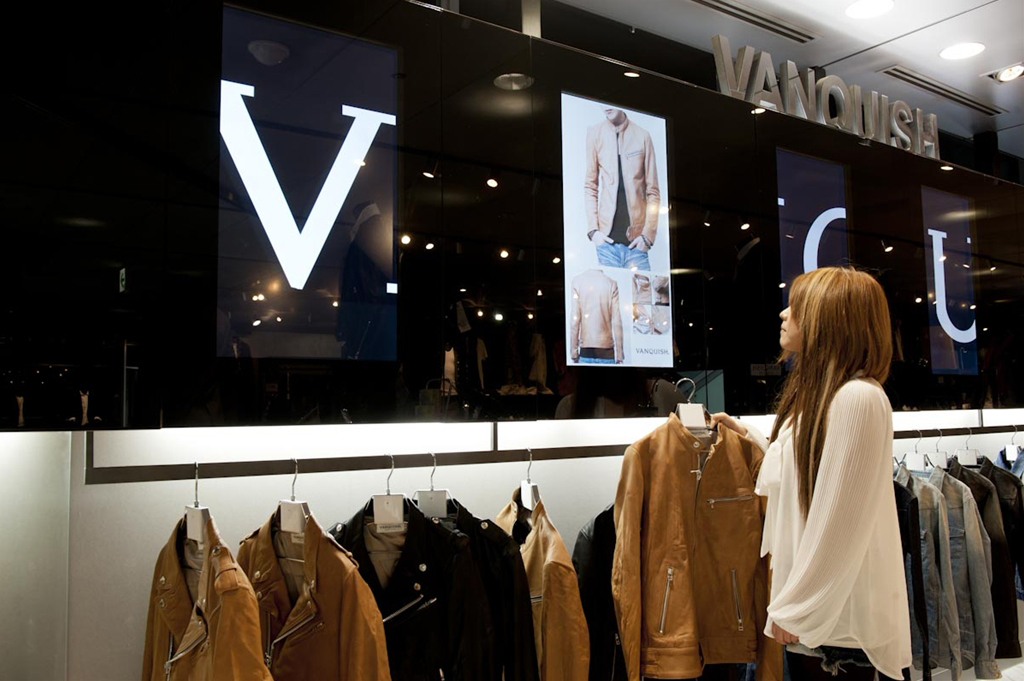 La marca de ropa de alta costura japonesa Vanquish ha instalado en sus tiendas un novedoso sistema interactivo que propicia que, cuando el comprador levanta una percha con una prenda de ropa, un video relacionado con dicha prenda aparece en la pantalla que tiene delante.
