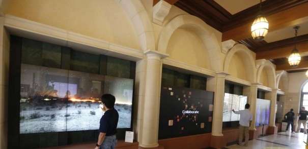 La pantalla, que cubre seis grandes nichos de los soportales del vestíbulo del nuevo edificio de SCA Interactive Media, en la USC Shool of Cinematic Arts, se compone de dieciocho pantallas MultiTaction Cell de 55 pulgadas, con bisel ultra delgado, para crear una experiencia visual interactiva de gran impacto con un número ilimitado de puntos de contacto y usuarios simultáneos.
