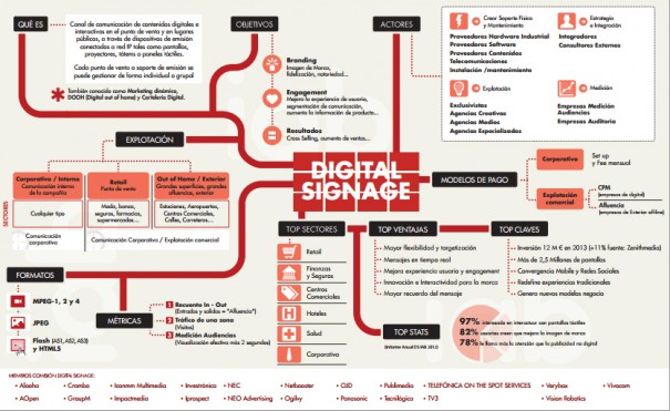 IAB Spain ha dado a conocer la infografía del mercado de digital signage. Un documento que recoge, de forma gráfica, los aspectos claves de un mercado que cada vez va ganando más peso en los presupuestos de inversión publicitaria digital, con unas cifras que se espera lleguen a los 12 millones de euros en 2013 y para el que se están utilizando más de 2,5 millones de pantallas. “Las agencias ya están planificando campañas Cross-Media, de web a mobile pasando por redes sociales o TV conectada, siendo el Digital Signage el nuevo exponente de la innovación digital”, explica Javier Clarke, director de Mobile & New Media de IAB Spain.