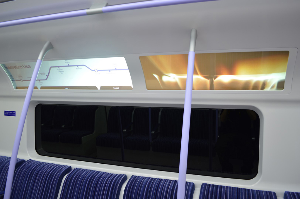 Los Tube Car Panels (TCP frames) del tren, diseñados por Paradigm AV al igual que las pantallas de la estación, permite ver imágenes digitales sobre una superficie curva, ubicadas en el interior de los vagones. Para ello, Para ello, Paradigm AV ha utilizado dos proyectores Panasonic PT- RZ470 con lente estándar y dos Calibre HQView320 para realizar la deformación. Estos se acompañan de torres de proyección trasera Paradigm y dispositivos de montaje.