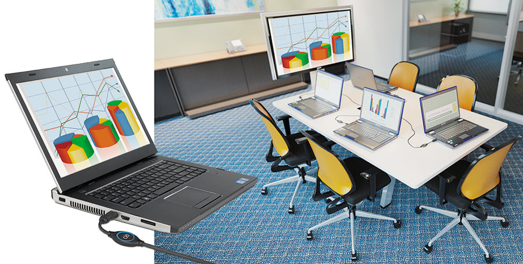 El sistema de trabajo en equipo está diseñado para ofrecer un funcionamiento sencillo e intuitivo con una formación mínima. Los usuarios sólo tienen que conectar su ordenador portátil o tablet al cable Show Me para iniciar el sistema y pulsar el botón Share (Compartir) para mostrar su contenido en la pantalla de presentación. Cuando haya terminado, los usuarios se desconectan y se van , y el sistema TeamWork se apaga automáticamente y está listo para la próxima sesión de colaboración.