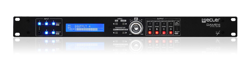 DAM514 es un mezclador digital de audio de la firma Ecler que incorpora cinco entradas y cuatro salidas, procesamiento DSP, conectividad RS-232 y cuatro puertos de control remoto (0-10 VDC). Sus cuatro salidas pueden ser configuradas como zonas mono o estéreo (en parejas). En cuanto a las entradas, tres de ellas son de tipo Línea estéreo y la cuarta y quinta son MIC/Línea, configurables en modo mono independiente o bien como otra pareja estéreo adicional.