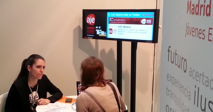 AJE Madrid ha confiado su comunicación y promoción durante la V edición del Salón Mi Empresa, que se celebró del 18 al 19 del presente mes en Madrid, en el sistema de cartelería digital LiquidImages de la empresa española Alzinia, para fomentar, promover y orientar a los jóvenes como futuros empresarios y emprendedores.
