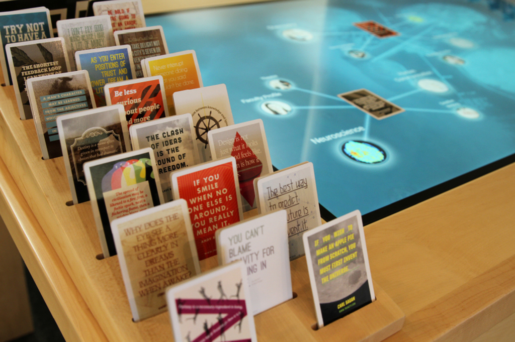 Cada tarjeta incluye una cita de algún personaje famoso y pioneros en su campo, como esta de Steve Jobs: «El diseño no es sólo lo que se ve y se siente. El diseño es cómo funciona”. Cuando la carta se coloca en la pantalla, muestra los campos académicos referentes al diseño, la historia del arte, la ingeniería y la ciencia, así como miembros del cuerpo docente de la Universidad de Trinity que imparten clases en estas áreas.