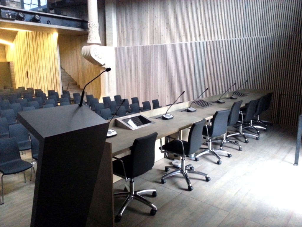 La mesa presidencial de cada una de las salas dispone de un sistema de conferencias, con módulo de traducción multilingüe inalámbrico, además de monitores HD encastrados en la misma para el seguimiento de la actividad de sala.
