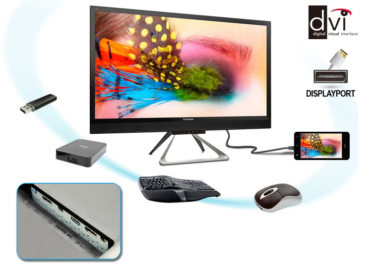 ViewSonic-VX2880mlEl VX2880ml ofrece conexiones MHL (Mobile High-Definition Link) HDMI, DisplayPort y mini DisplayPort para una conectividad flexible y preparada para el futuro. Su salida DisplayPort permite que pueda ser conectado en red cadena con varias pantallas e incrementar la productividad para situaciones multitarea avanzada.