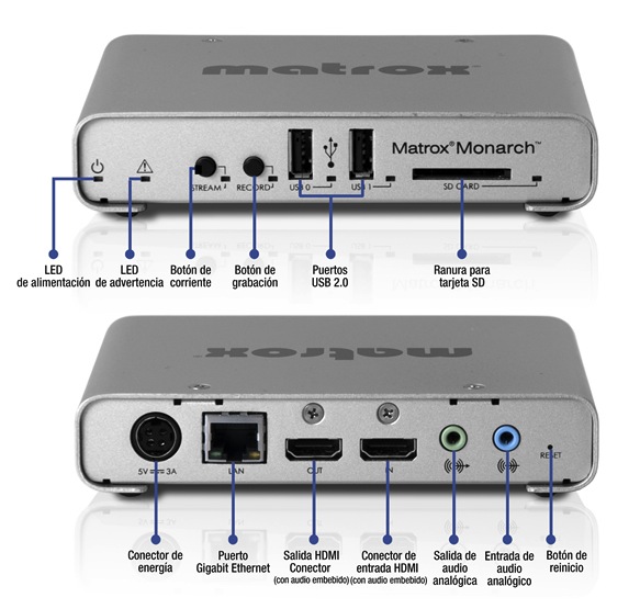 Monarch HD es la propuesta de Matrox para transmisión y grabación de vídeo. Se trata de un codificador H.264 pequeño y fácil de usar, diseñado para los productores de vídeo profesionales que necesitan transmitir un evento en directo y grabar simultáneamente una versión de calidad superior para las posteriores tareas de edición. Desde cualquier fuente de entrada HDMI, por ejemplo, una cámara o un conmutador, Matrox Monarch HD genera una transmisión con codificación H.264 que cumple con el protocolo RTSP o RTMP.