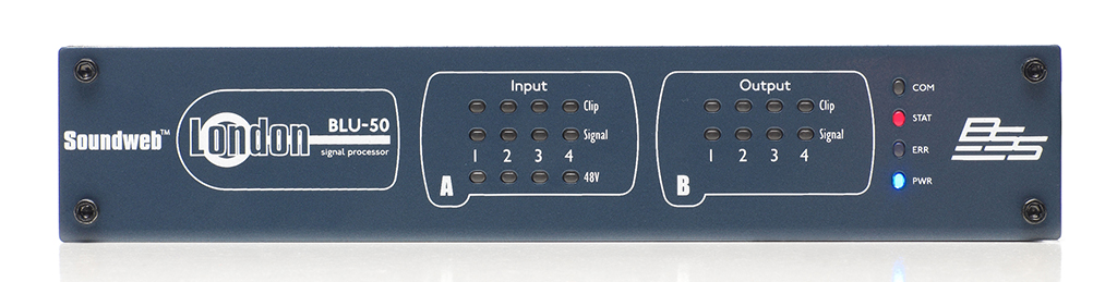El BLU-50 es un procesador de media unidad de rack que ofrece una configuración fija de cuatro entradas y cuatro salidas, proceso de señal configurable, proceso lógico y Blu link. Este equipo se puede alimentar con la fuente de alimentación de 12VDC que incorpora, aunque también acepta alimentación de 12-48 VDC inyectada a través de un conector tipo bloque terminal. El BLU-50 también admite alimentación vía Ethernet (PoE+) a través del puerto Ethernet. Esta última opción permite la alimentación, configuración, control y monitorización del sistema mediante un solo cable Cat 5e.
