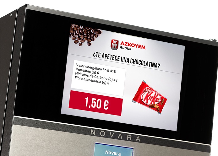 El sistema cuenta con una pantalla de 15 pulgadas en la que se muestran promociones de cafés Premium de la propia máquina de vending, snacks de otra expendedora esclava, así como información nutricional de las bebidas, a la que, según la compañía, se añadirán en breve nuevas funciones, como información general (noticias, tiempo, juegos,…) o un canal para mostrar información del lugar en que están instaladas las máquinas vending.