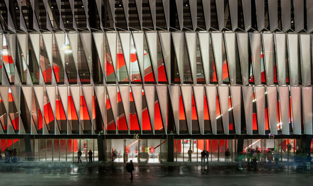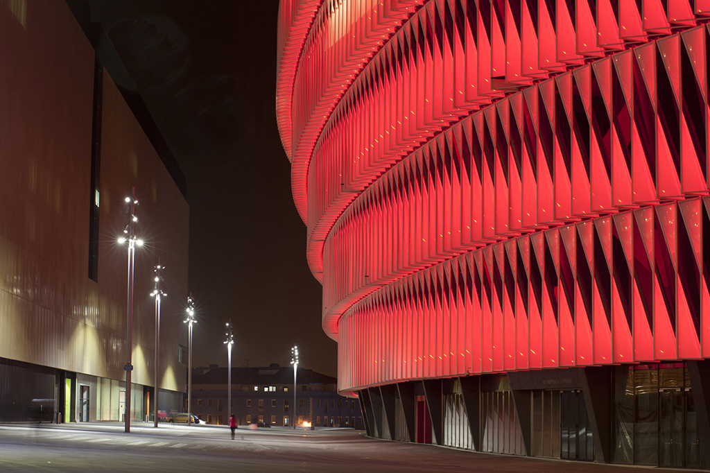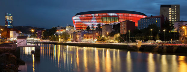 La fachada multimedia de 360 grados da un carácter único al estadio de San Mamés, creando un hito urbano sobre la ría de Bibao.