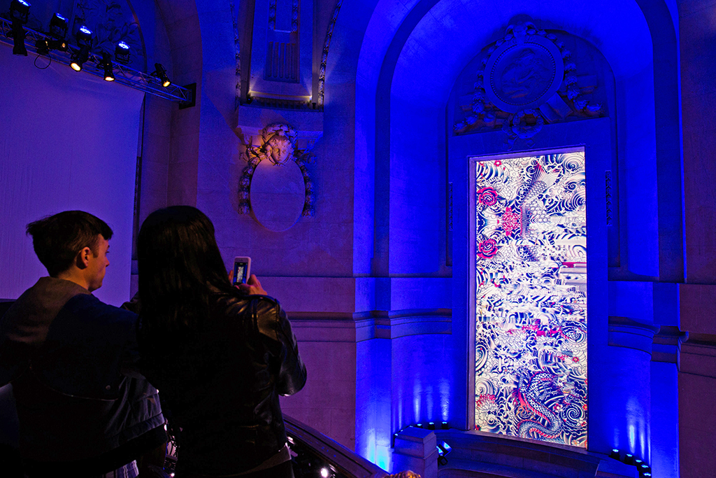 Contrastando las líneas clásicas de estilo barroco de la escalera ondulante con imágenes audaces que recuerdan el enfoque de Gaultier en alta costura, la instalación invita al público a dejar su huella en la pasarela.