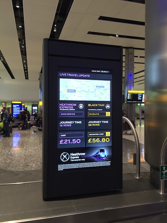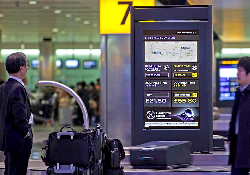 El aeropuerto de Heathrow es de nuevo un referente en ofrecer servicios de comunicación digital al servicio del pasajero a través de su red de pantallas DooH operadas por JCDecaux. En esta ocasión, se trata de un comparador entre Heathrow Express, el servicio de tren, y el que ofrecen los famosos black taxis, cuyos precios varían en función de la duración del viaje y de la distancia recorrida.