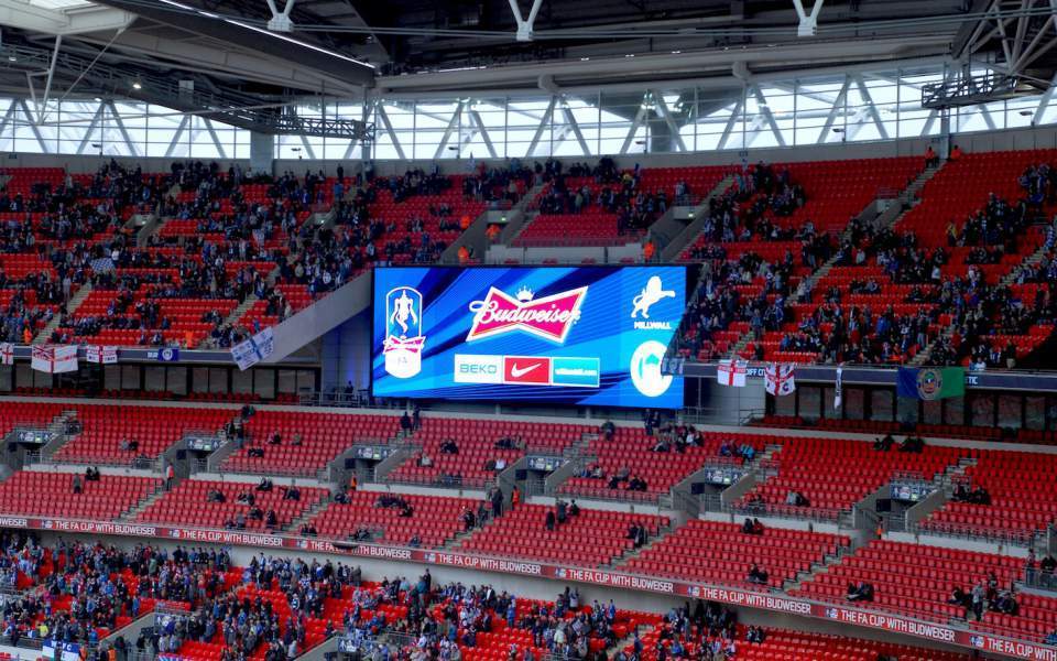 El sistema de visualización de Daktronics en el estadio de Wembley incluye dos pantallas principales de vídeo con el aspecto de curva única de la compañía, y una pantalla de cinta que da vueltas por el interior del recinto en las zonas de descanso y vending para los aficionados.