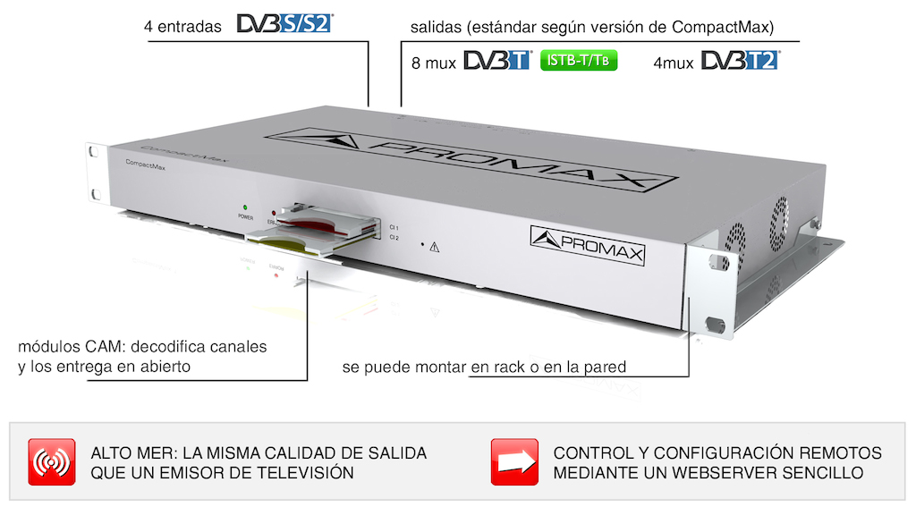 El sistema CompactMax desarrollado por Promax está disponible en la mayoría de los formatos de televisión digital del mundo DVB-T, T2, ISDBT, etc.) y resuelve de manera sencilla y eficaz la necesidad que tienen muchos instaladores cuando hay que dar servicio a hoteles, edificios singulares, redes de cable, etc. en la conversión de TV satélite a TV terrestre.