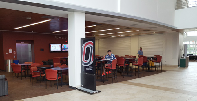 En el vestíbulo principal del edificio Mammel de la Universidad de Nebraska en Omaha se ha instalado una pantalla DF-55 de doble cara que es utilizada para la notificación de eventos.