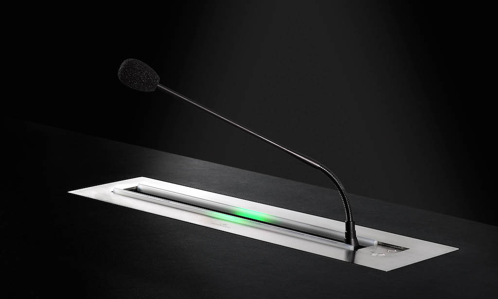 Este sistema de retracción horizontal para micrófonos de cuello de ganso se presentará por primera vez en el World Trade Centre de Dubai durante este certamen dedicado al diseño de espacios de trabajo.