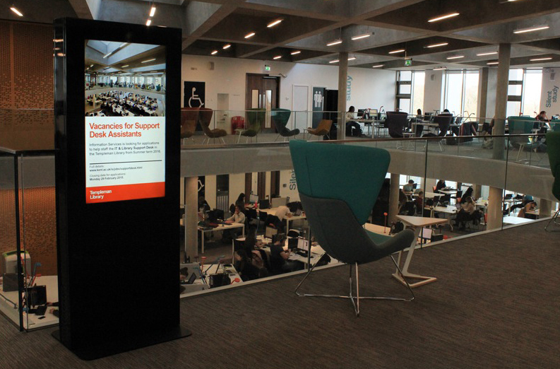 La Universidad de Kent enseña más de 15.800 estudiantes en su campus de Canterbury y acaba de celebrar su cincuenta aniversario. Una de las partes más importantes de este centro docente es la Biblioteca Templeman (Templeman Library), una zona que recientemente ha sido remodelada transformándola en una instalación moderna en la que se han incorporado las últimas tecnologías para fomentar el aprendizaje. Asimismo, también querían incorporar una estrategia de digital signage para asegurar que la información crítica se entregara con rapidez y eficiencia a los estudiantes.