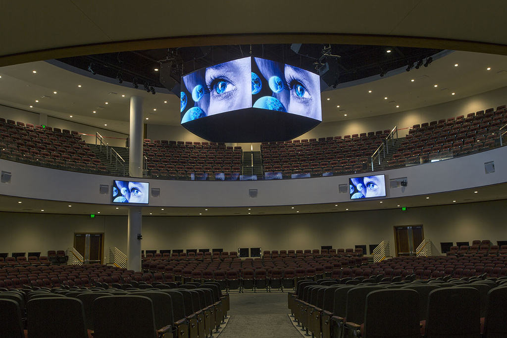 Además, el peso total de esta solución de visualización tenía que ajustarse a la arquitectura del techo del edificio. “Con en esta disposición circular una parte del público siempre estará situada situado en la parte trasera del orador. Es por esto que se precisaba un sistema de múltiples paneles compuesta por pantallas Led curvas que se pudieran ver con claridad desde la parte frontal de cada asiento del teatro, independientemente de la ubicación”.