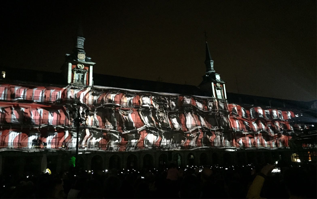 Según sus organizadores, este es el mapping más grande que se ha realizado hasta la fecha en nuestro país. Sobre una superficie de 5.750 metros cuadrados se han proyectado imágenes que han realizado un recorrido por la historia de esta centenaria plaza. Desde que a finales del XVI fuera un pequeño lago en el extrarradio de la Villa, donde los monarcas cazaban patos, pasando por su uso como mercado del Arrabal en el XVI y la configuración de la plaza en el XVII. Una plaza que ha vivido diferentes coronaciones, incluida la beatificación de San Isidro, y fiestas barrocas, ha sufrido incendios que forzaron su reconstrucción a finales del siglo XVIII, festejos goyescos y ha sido protagonista de las ejecuciones realizadas durante la Inquisición.