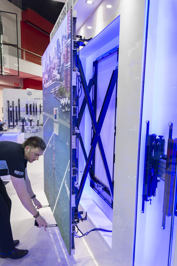 Otra de las propuestas que captó un gran interés fue su solución universal de extracción de panel Led de 4 mm. de píxel pich, suministrado por el especialista Handy AV, al que se accede simplemente pulsando un botón y utilizando dos asideros retráctiles. “Un sistema de montaje simple y accesible que encantó a los integradores -recuerda este directivo-, hasta el punto de que perdimos la cuenta del número de veces que lo probaron”.