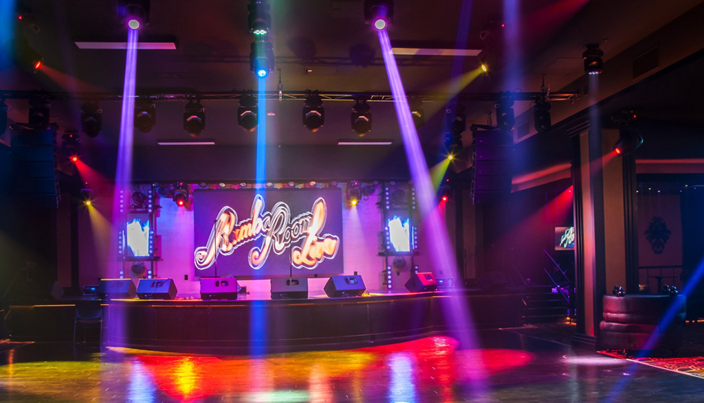 Rumba Room también ofrece conciertos de variados estilos musicales y cuenta con un escenario que es iluminado con 12 cabezas móviles Led tipo Beam/Wash con Zoom Rayzor Q12 Zoom, junto a 15 unidades del SixPar 100, proporcionando iluminación trasera, y 6 cabezas móviles Platinum Spot Led Pro II, que añaden proyecciones de gobos y efectos con su prisma de 3 lados.