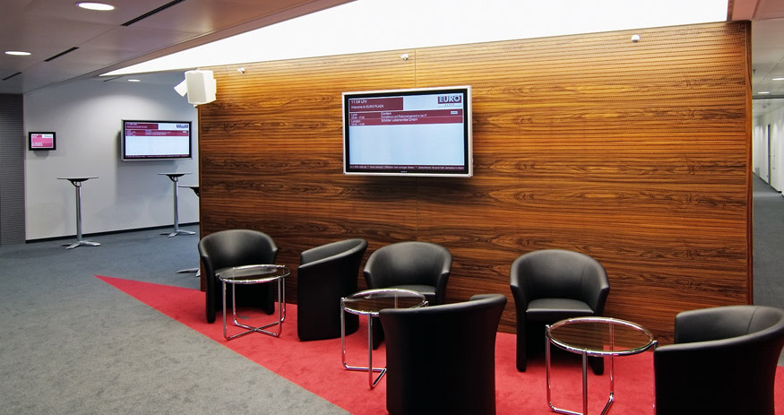 Todos los datos relevantes para ello, tales como nombre del evento o reunión, inicio y finalización del mismo, logotipo de empresa, entre otros, pueden agregarse y actualizarse fácilmente para que se muestre en las pantallas exteriores de las salas de reuniones, recepción, etc.