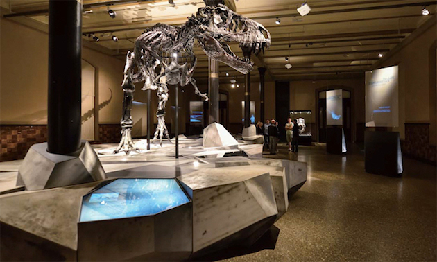 Los doce metros de huesos fosilizados que forman el esqueleto de T-Rex se alzan sobre una gran plataforma que simula una zona rocosa, fabricado ex profeso para la muestra, y en la que se han instalado seis vitrinas que, aparentemente, sólo exhiben simples réplicas de algunos de sus huesos. Sin embargo, cuando los visitantes pulsan el botón integrado en la vitrina, estas se llenan de luz y comienzan a mostrar imágenes muestran más detalles sobre el protagonista de esta sala.