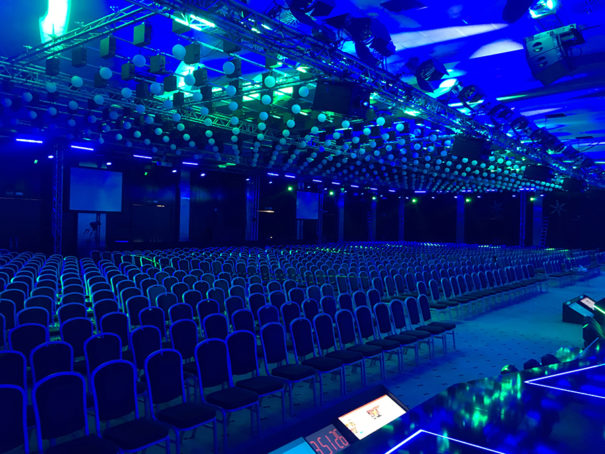 Para este evento se utilizaron alrededor de 300 esferas RGB, conectadas, cada una de ellas, a un motor DMX y gestionadas a través de mesa de luces GrandMa Full Size de MA Lighting para aplicar las diferentes configuraciones y programaciones de movimiento. El baile de luz y colorido se potenció con 10 máquinas láser, gestionadas con Láser Animation, que al ritmo de la música ofrecieron una actuación que sirvió de cierre del evento, todo ello potenciado por las más de 100 cabezas móviles y 8 máquinas de humo para crear una atmósfera envolvente.