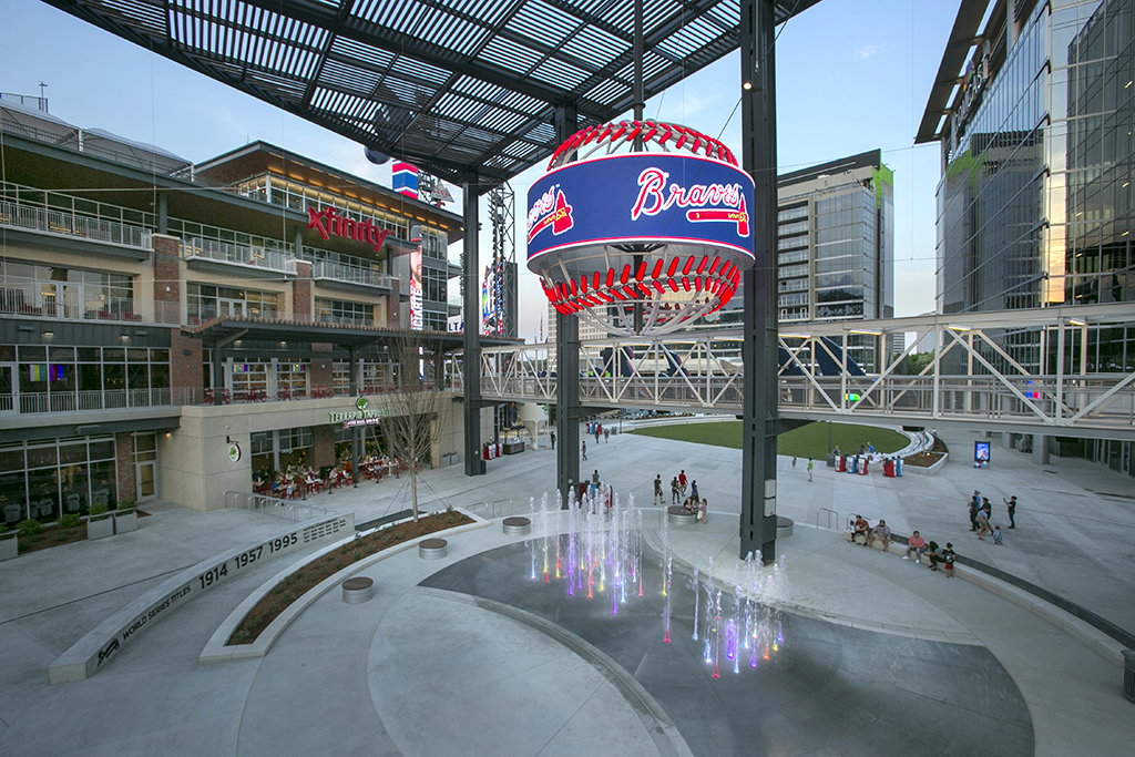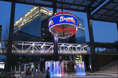 El Battery Atlanta es un espacio donde se fusionan los negocios y el ocio que se encuentra localizado junto al nuevo estadio SunTrust Park, sede de los Atlanta Braves. Para este centro, Nanolumens ha diseñado una innovadora pantalla circular de 2,7×21 metros que ha sido construida alrededor de una ‘pelota de béisbol’ y permanece suspendida sobre una fuente de agua.