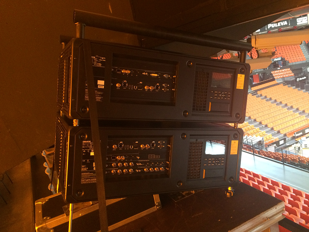 Los dos proyectores fueron colocados en tándem, en el palco reservado a la prensa, a una distancia de proyección de 30 metros, trabajando con ópticas gran angulares e inclinados 17 grados para abarcar toda la pista.