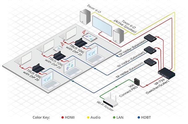 La solución completa cuenta con el receptor TP-780Rxr, un sistema PoE HDBaseT para señal 4K60 4:2:0 HDMI HDCP 2.2; la solución modular de conexionado para mesa Tbus 10XL; el transmisor DIP 20, y la solución de presentación y colaboración inalámbrica VIA Connect Pro, junto con los altavoces auto amplificados Tavor 6, de dos vías y 6,52.