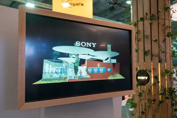 En el centro del stand se encuentra instalada la gran pantalla Crystal Led sin bisel de Sony, que ofrece imágenes visuales 8Kx2K y contenido ultrarrealista para una gran variedad de sectores diferentes. Con una alta calidad de imagen, ángulos de visión de hasta 180 grados y una óptima capacidad de ampliación, esta solución es capaz de transformar las presentaciones visuales, simulaciones y entornos de entretenimiento.