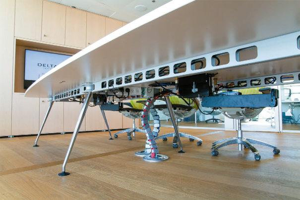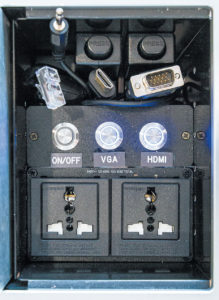 Delta Galil pidió controladores de botones sencillos para las salas de reuniones. AVCS integró una caja Cable Cubby 700 de Extron, el sistema de retracción y sujeción de cables Retractor Series/2 y el control remoto con tres botones por cierre de contacto CCB 30 para cumplir con estos requisitos. Los módulos de alimentación utilizados en la caja Cable Cubby proporcionan alimentación de CA a los dispositivos personales, y el sistema Retractor con módulos de cables HDMI, VGA y de audio soporta la conectividad AV. Los tres botones del panel CCB 30 están configurados para encender/apagar el sistema AV y permitir la selección entre fuentes activas.