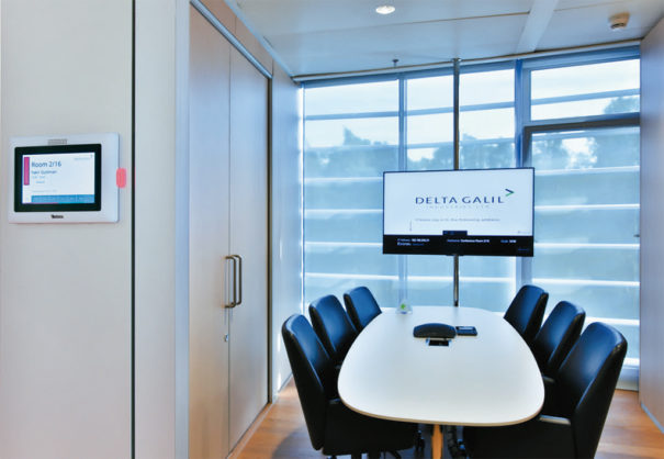 Montada en la pared, fuera de cada espacio de reuniones, hay una pantalla táctil TouchLink Pro TLP Pro 520M de Extron. El panel con pantalla táctil capacitiva de 5 pulgadas se configura utilizando el software Room Agent, que la transforma en un dispositivo independiente y multifunción de reserva de salas. No es necesario un servidor intermedio, ya que se comunica directamente con el servidor Microsoft Exchange de Delta Galil.