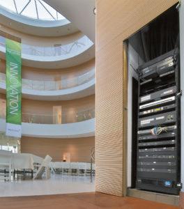 Un rack en un armario de equipo, situado fuera del auditorio, alberga la matriz de conmutación DTP CrossPoint, el sistema de videoconferencia, el procesador multimedia para streaming SMP 351 y el procesador de control IPCP Pro 550, así como las puertas de enlace ShareLink y los dos sistemas de sonido.