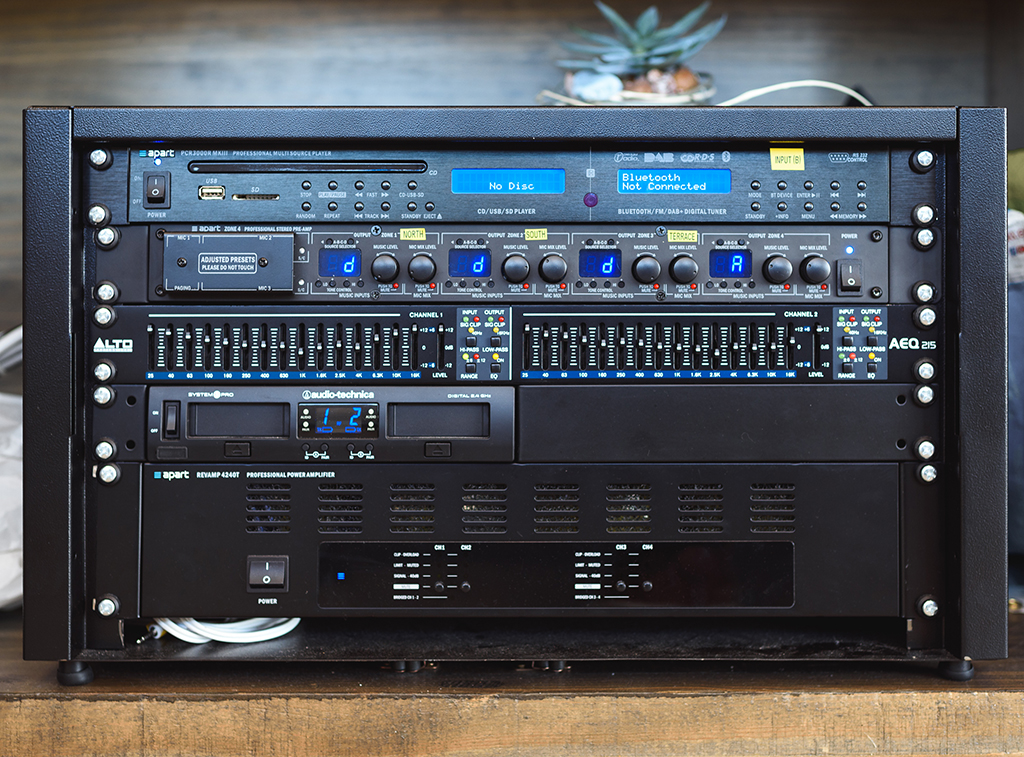 La instalación cuenta con diferentes sistemas de Apart Audio entre los que se encuentran 16 unidades Mask6CT, el amplificador digital de potencia Revamp4240T, el preamplificador Zone4 y el reproductor PCR3000RMKIII. A estos se une el ecualizador Alto AEQ215 y el sistema inalámbrico digital System 10 Pro de Audio-Technica.