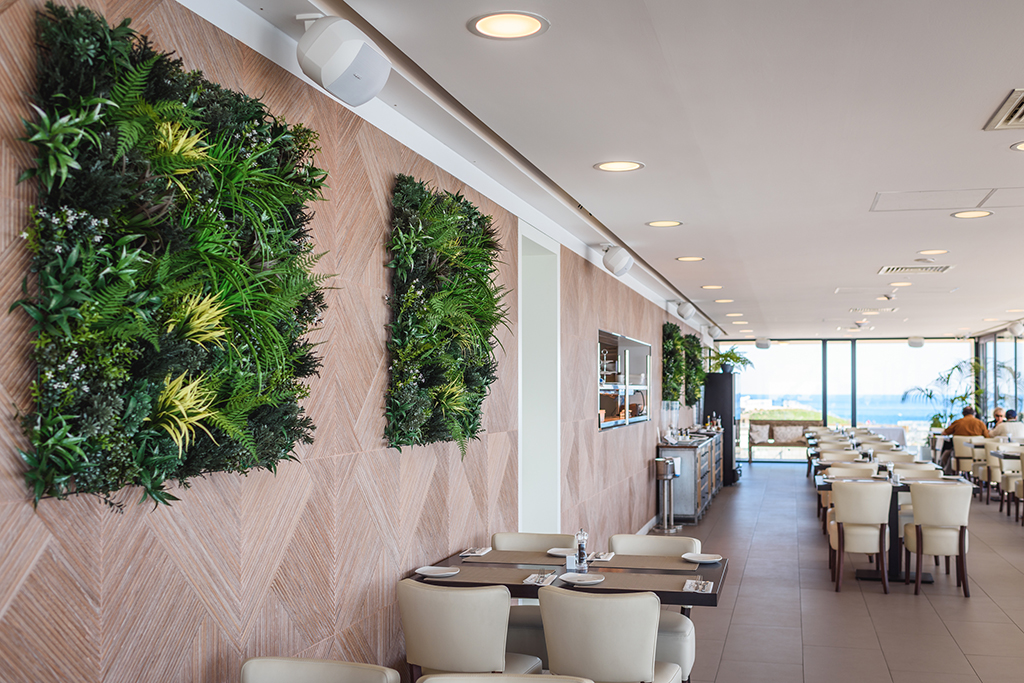 El restaurante está dividido en tres zonas independientes, lo que permite que en todo momento exista un nivel sonoro adecuado. La instalación cuenta con diferentes sistemas de Apart Audio entre los que se encuentran 16 unidades MASK6CT, un recinto acústico de 2 vías, 6,5 pulgadas, que ofrece el sistema de montaje ClickMount.