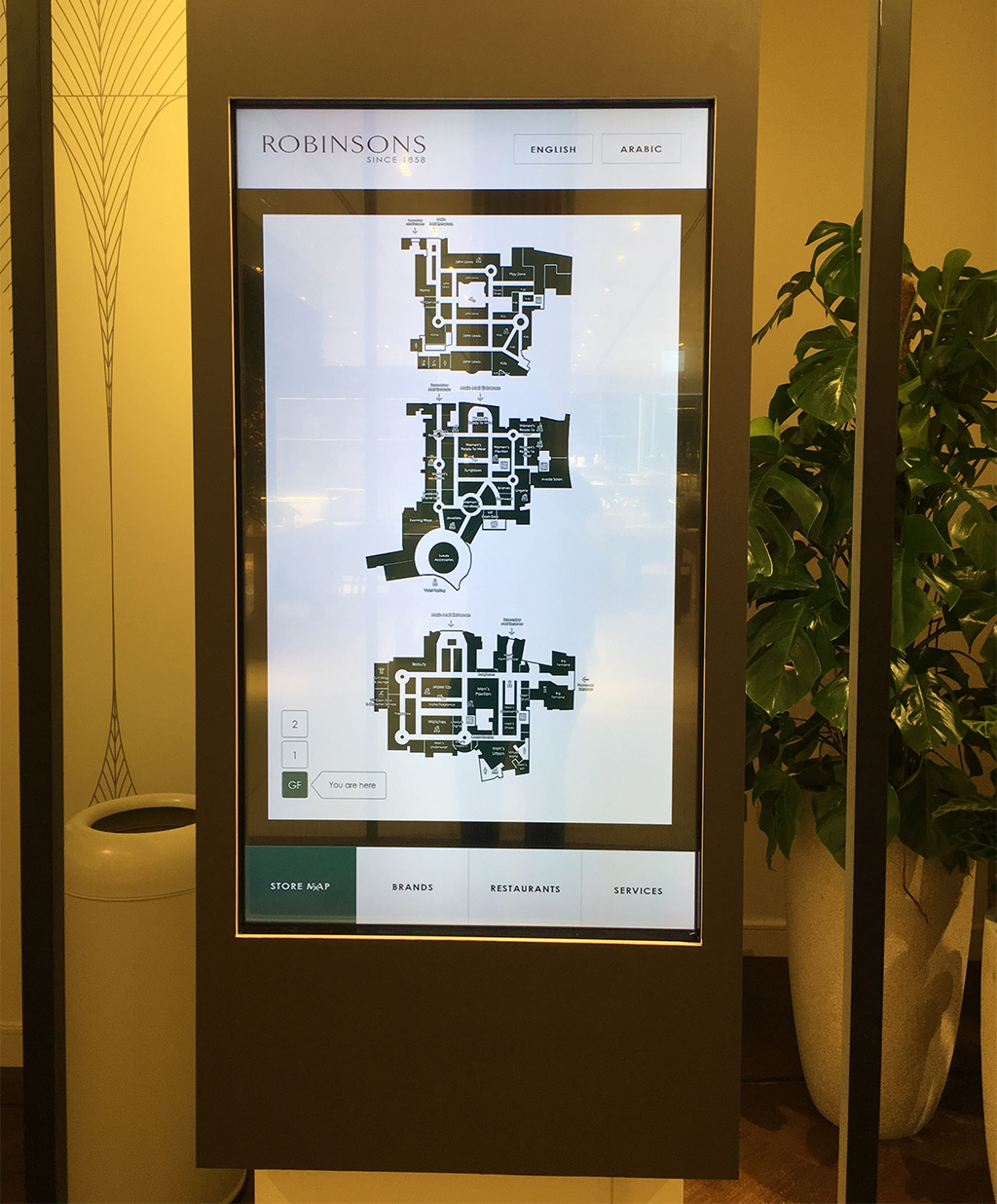 Esta infraestructura de señalización digital también está integrada por pantallas táctiles de 49 pulgadas, dotadas con la tecnología de los reproductores BrightSign XD1033. Estos way finders orientan a los clientes para moverse por la tienda y les lleva a marcas específicas, proporconando información sobre las marcas y los productos. La interactividad y todo el contenido están gestionados por los jugadores de BrightSign que ejecutan el software BrightAuthor.