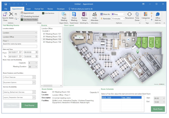 Por último y próximo a lanzarse, está el calendario de Liso Add-on para Outlook, un complemento de suscripción que funciona con Outlook y ofrece la posibilidad de reservar catering y equipamiento. Permite al organizador tener un mayor control sobre la reunión y todo lo que la rodea.