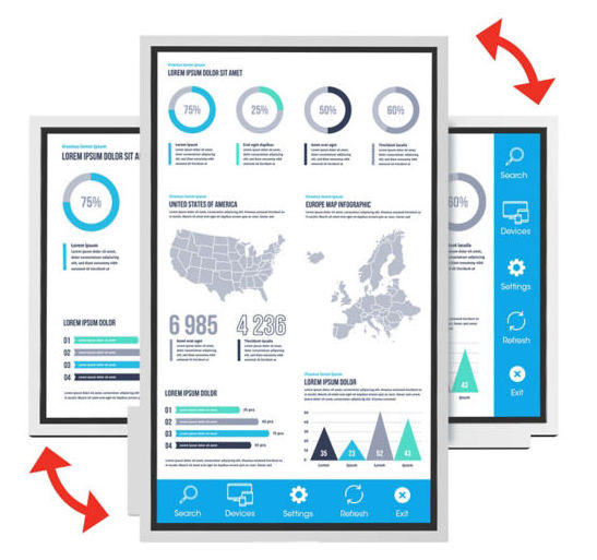 Una vez montada la pantalla en una sala de reuniones o aula, la inclinación negativa ergonómica y la rotación simple permiten a los usuarios escribir o dibujar fácilmente en orientación horizontal o vertical.