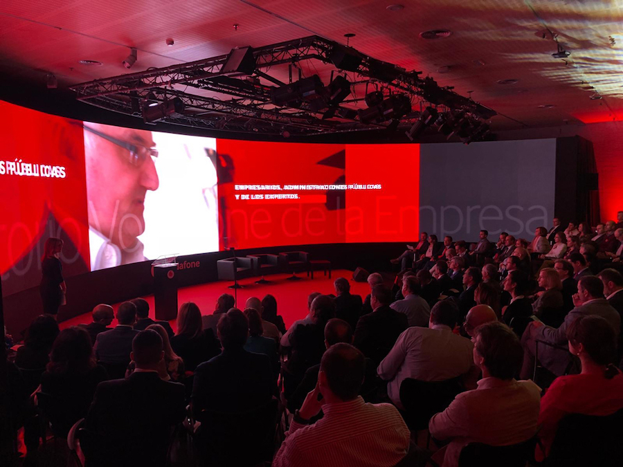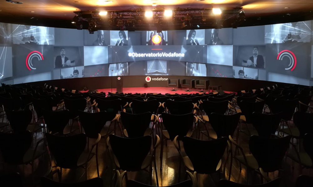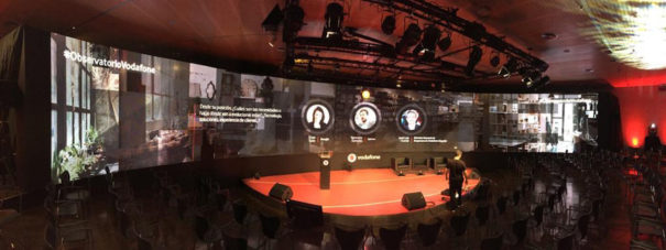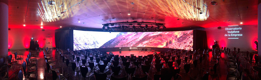 El evento de Vodafone, realizado en el Auditorio Gabriela Mistral, en la Casa de América en Madrid, para presentar su segundo estudio sobre el estado de la digitalización de la empresas y Administraciones Públicas españolas ha contado con Sono para realizar una puesta en escena impactante: una gran pantalla curva, de 23×3 metros, que además ofrecía una resolución de casi 5K para crear un efecto envolvente en la audiencia.
